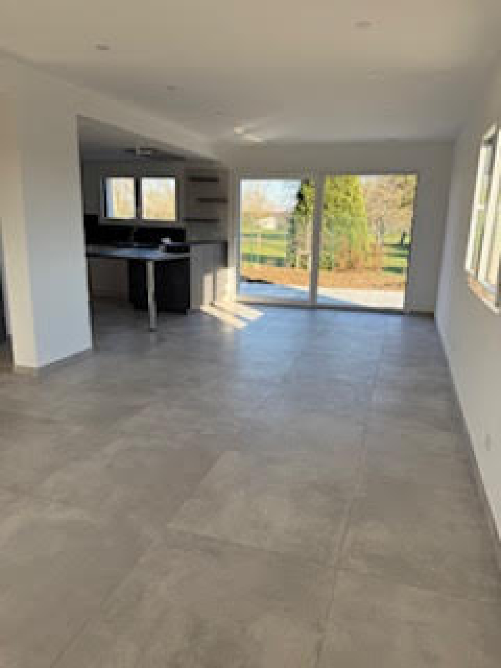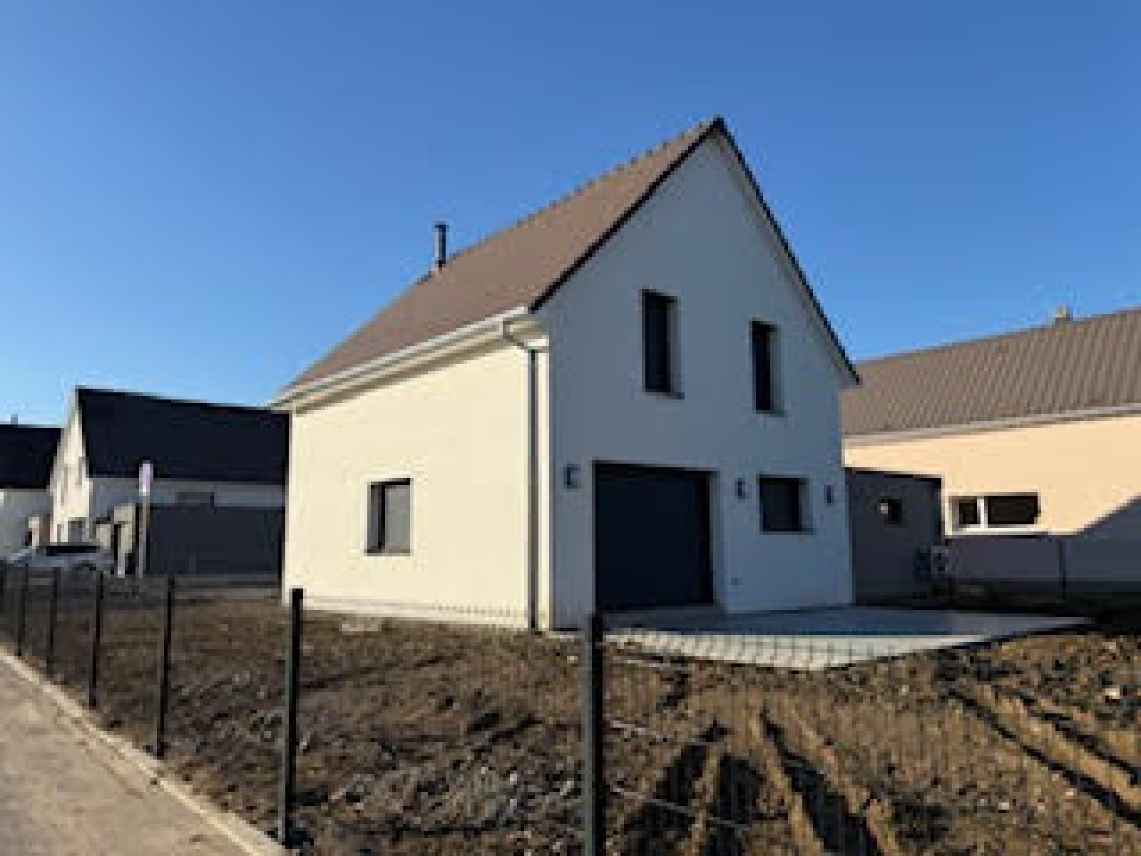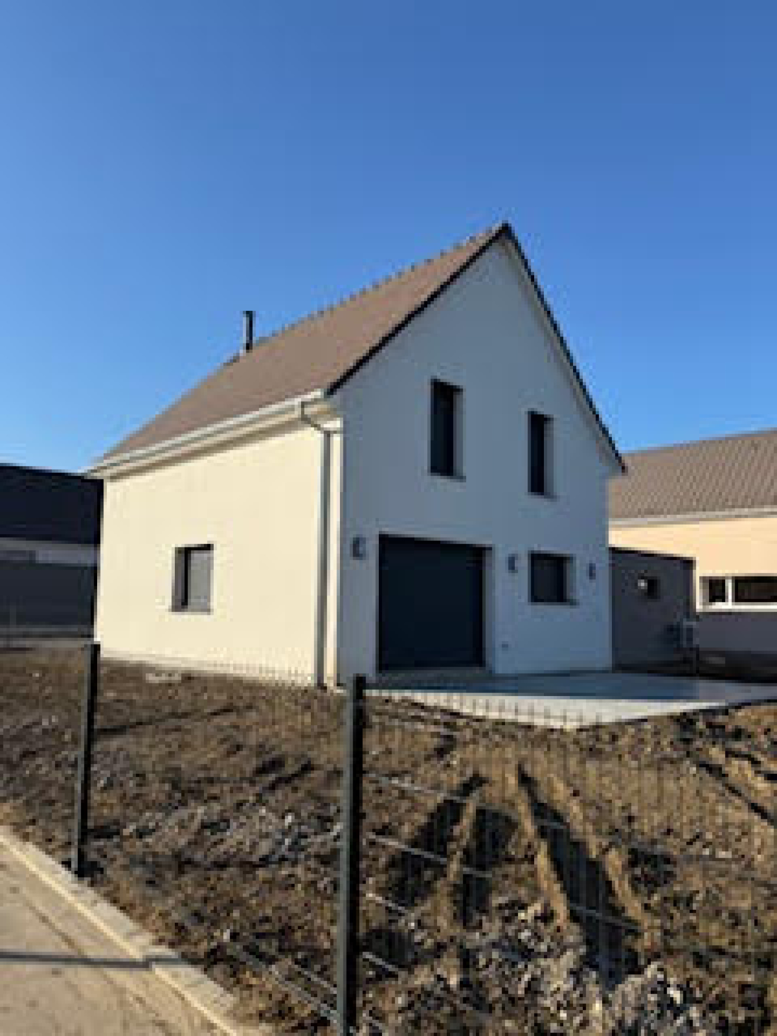 A l'extérieur : l'avant est pavé, l e jardin et la terrasse et la terrasse sont aménagés, le jardin engazonné et clôturé ( les photos datent de la construxction de la maison)