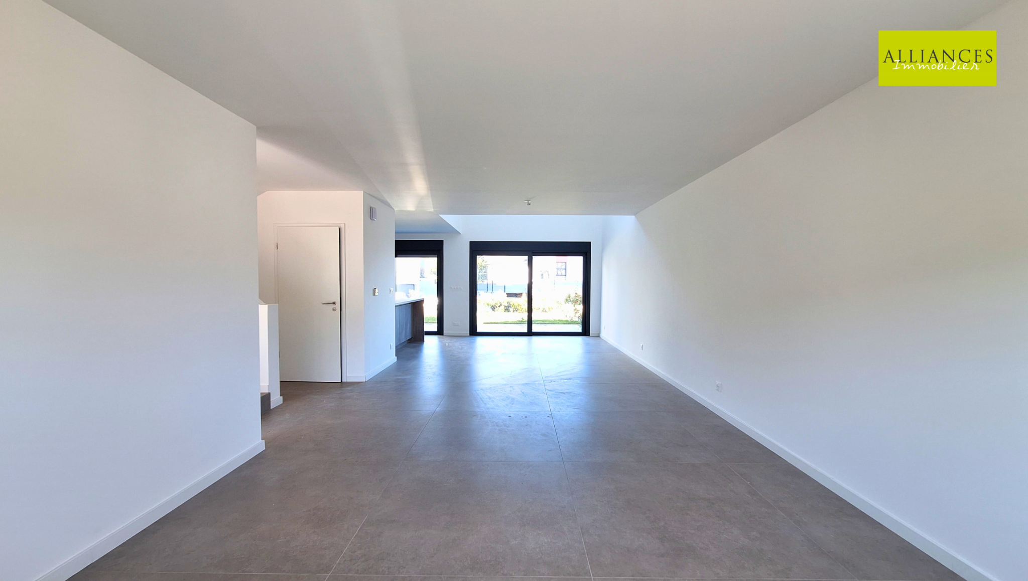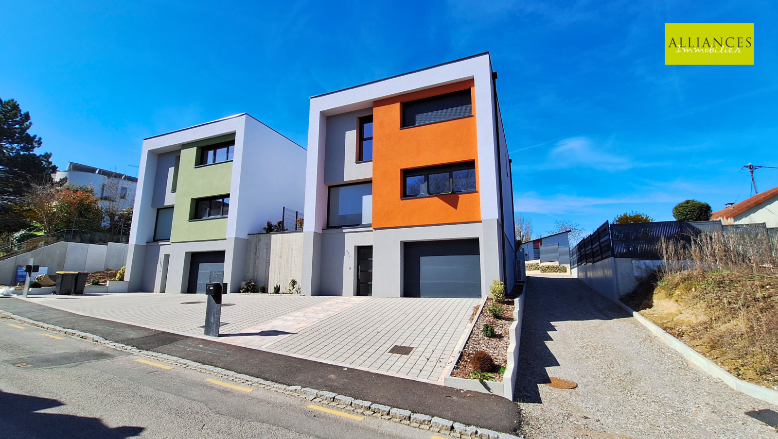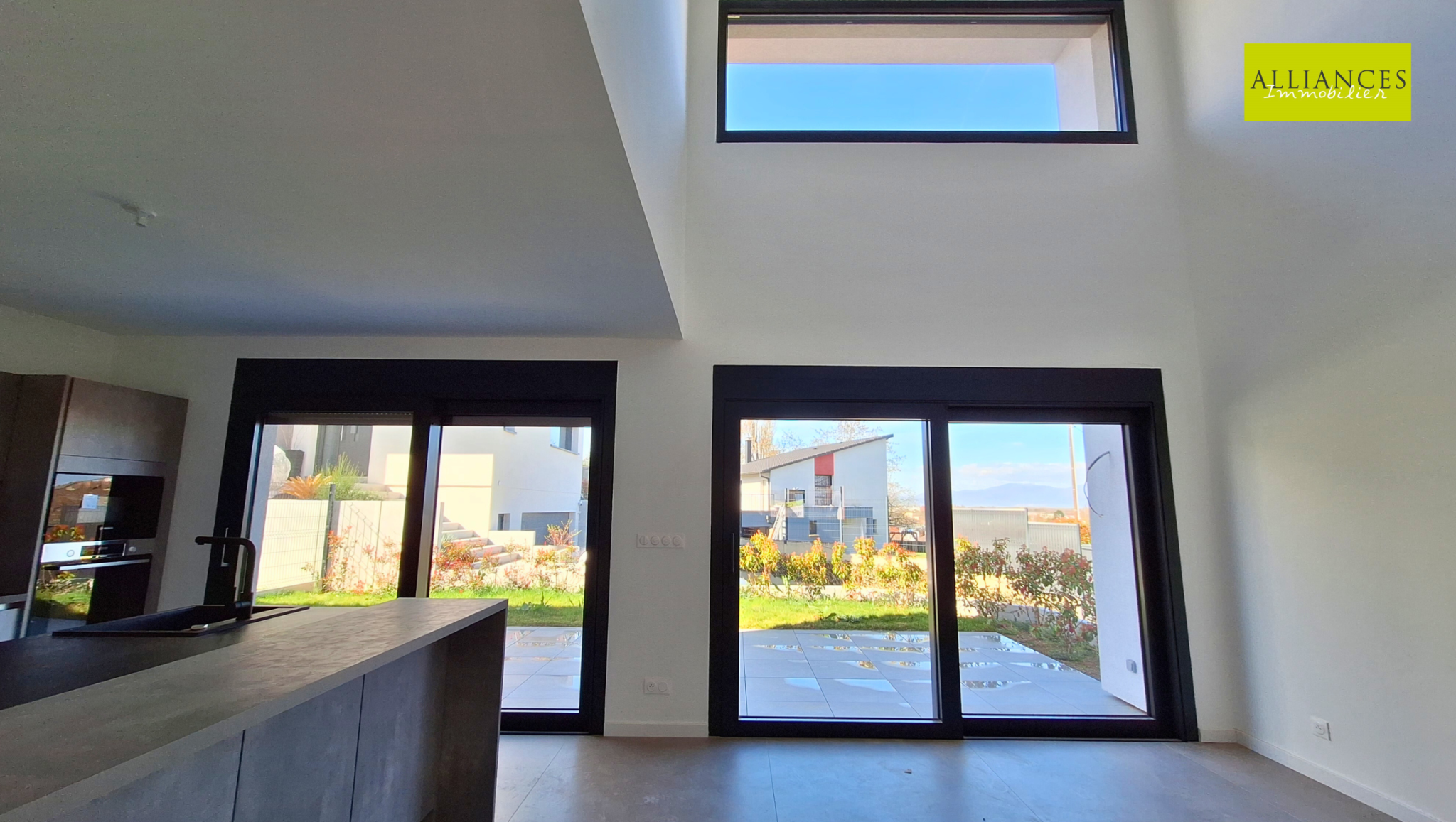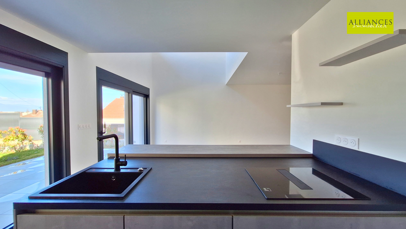 L'entrée se fait par le demi-niveau inférieur avec une pièce avec douche et vasque, WC, garage 2 voitures avec porte motorisée.