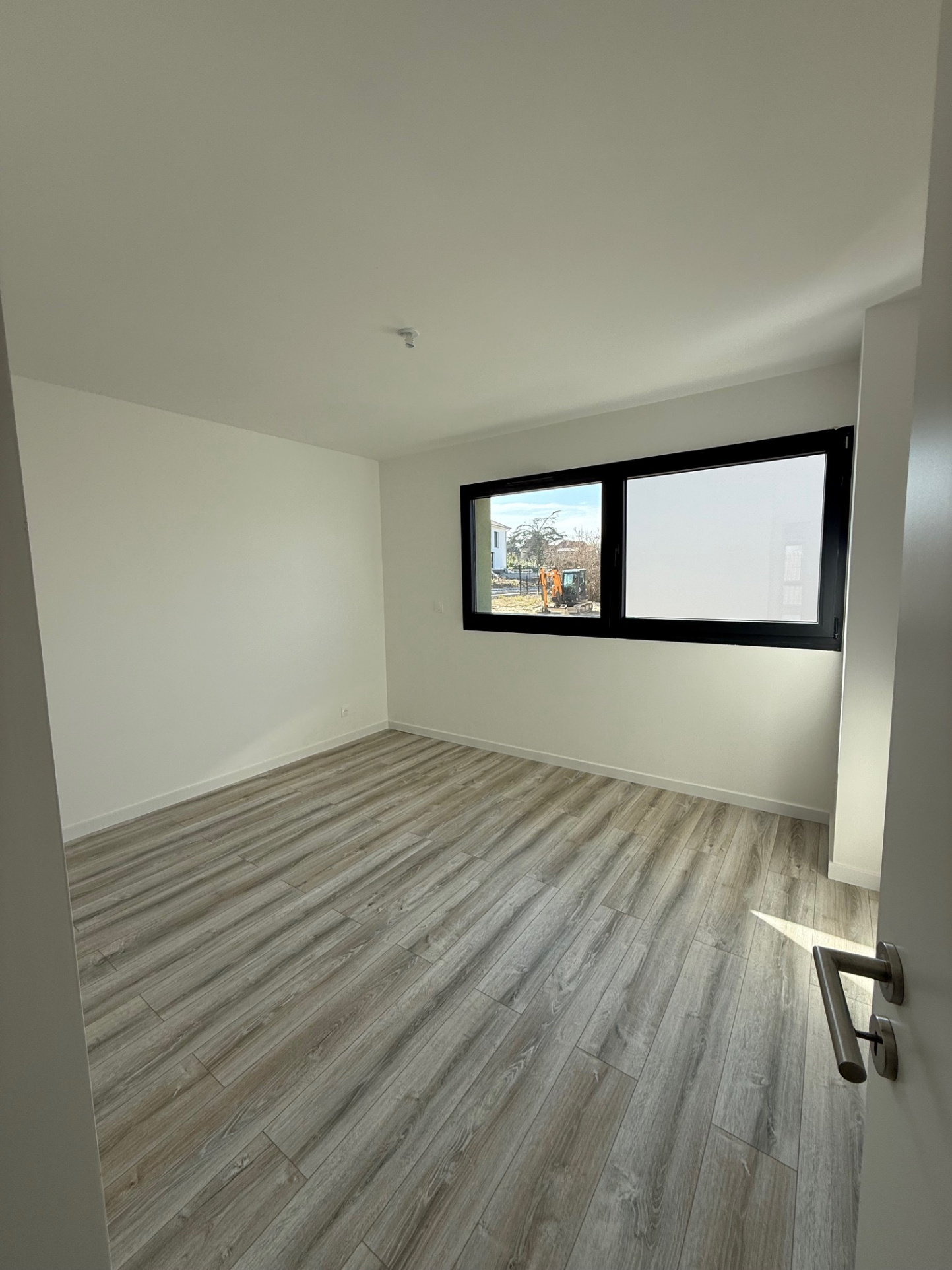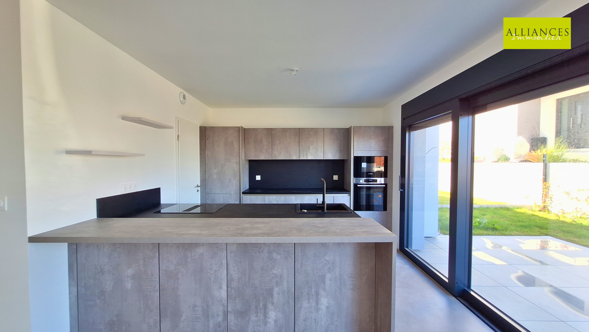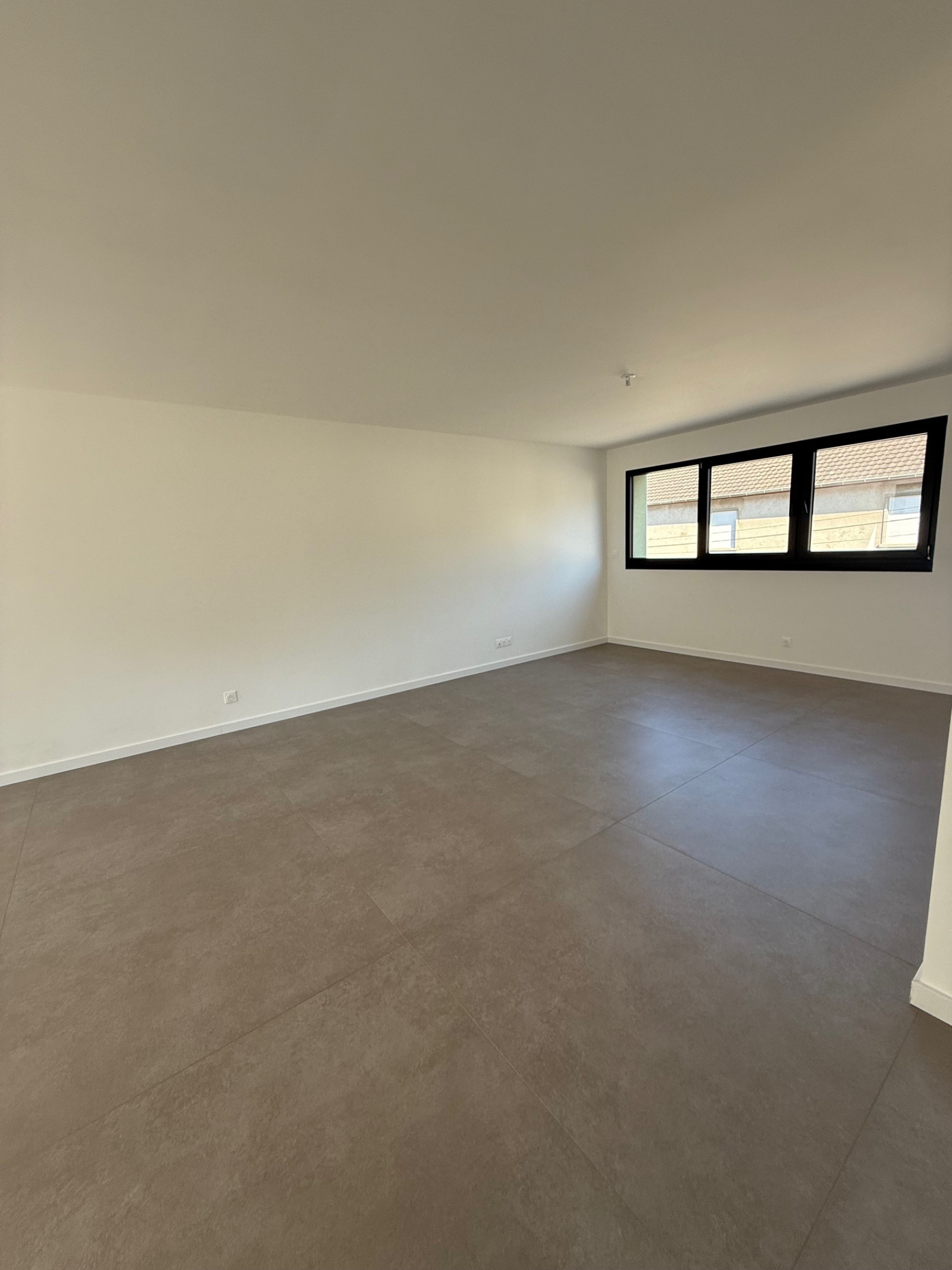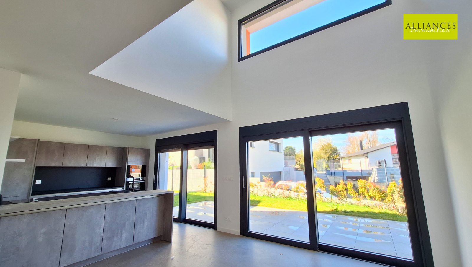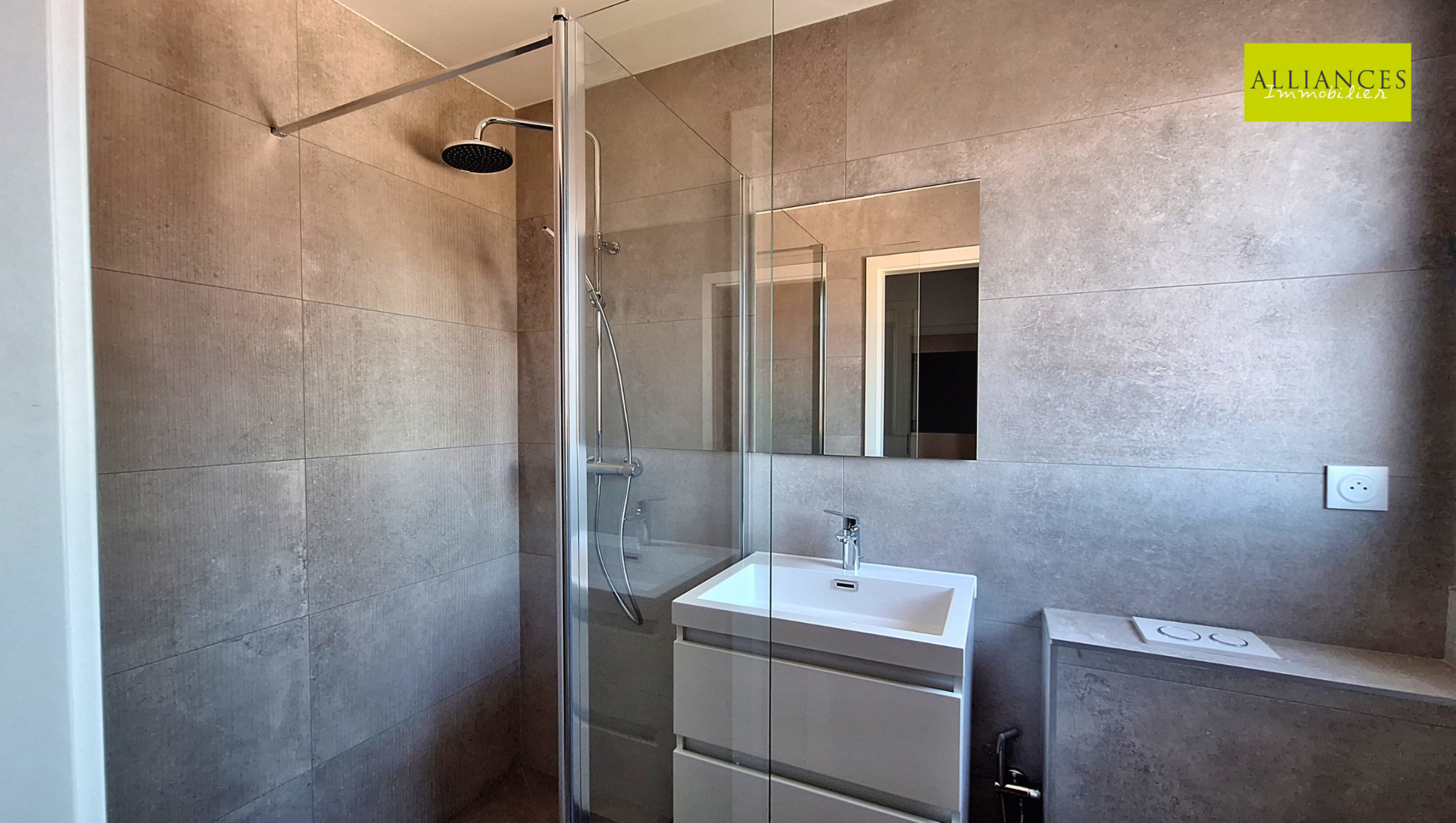 L'entrée se fait par le demi-niveau inférieur avec une pièce avec douche et vasque, WC, garage 2 voitures avec porte motorisée.